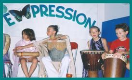 Un tambour de l’ouest africain et une variété d’instruments de percussion du monde entier sont fournis pour chaque étudiant ainsi que des costumes et des accessoires!